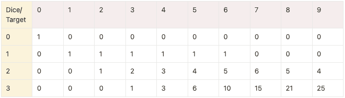 Numbers denote the amount of possible combinations for a given amount of dice (yellow) to reach a given target (brown). This would be the combination of the row and columns preceding the given cell starting from target - f.